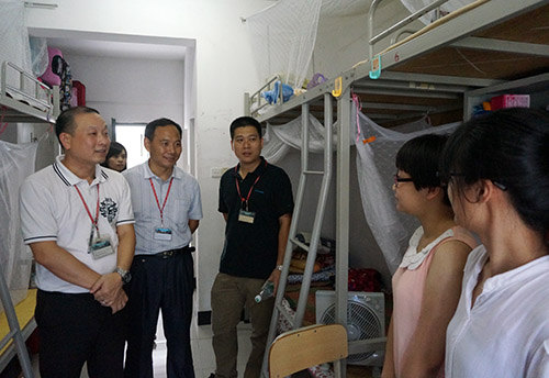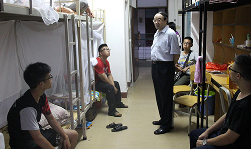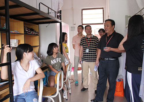 本网讯(记者 江颖诗 陈慕华 罗海东 刘影婷)9月6日,学校党委书记黎冬,副校长杨永强、赖志立、余庆安一行前往学生宿舍看望2014级新生。校领导们与新生们亲切交谈,了解他们的住宿和开学准备情况。