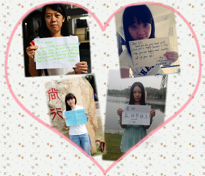 “大一时,Edward经常在课上给我们分享他在中国的生活趣事,我们还一起玩游戏,一起合照。他是我的第一位外籍教师,既是我的老师,但更像是我的朋友。祝愿他永远快乐,身体健康!”2013级英语传媒1班的曾敏对外教Edward表达了她的美好祝福。