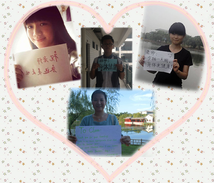 2013级英语传媒的袁广琼当初很害怕上台进行英语演讲,方慧老师耐心地帮她修改演讲稿,并不断鼓励她要加油,不要害羞,这才让她渐渐克服心理的恐惧感。“Clara虽然课上有些严厉,但是课后就像朋友一样。她非常尽责,所做的一切都是为了看到我们的进步。祝老师节日快乐。”这是 袁广琼最想对方慧老师说的话。