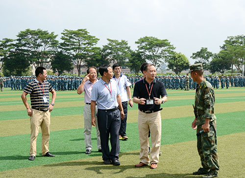 本网讯(记者 李俊熹) 9月15日上午,党委书记黎冬一行到军训现场慰问2014级新生。绿茵场上的迷彩服蔚为壮观。
