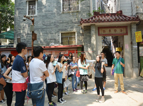 在《广东旅游》这门课程的教学活动中,任课老师让同学们以沿途导游的形式走访黄埔古村文化区、古商业街、古祠堂街和古港美食区,通过临场发挥编写导游词对景点进行介绍和讲解,现场模拟旅游带团场景。