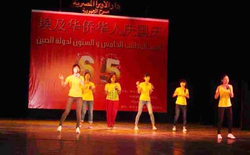 据我校留学生介绍,整场晚会精彩纷呈,中埃艺术家和青年学生同台演出,表演了各具特色的歌舞、健身操、太极拳等节目,赢得了观众阵阵掌声。我校留埃学生揭俊说:“这是我在异国他乡过的第一个国庆节,我到处搜索有关中国的新闻;每当一看到‘中国’二字,自豪感就油然而生。”