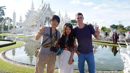 蔡锦霖(中)与旅途中认识的朋友游泰国白庙