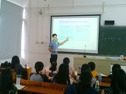 在《综合英语》课上,万宇婷老师在讲授新课前,通过自由会话的方式让学生大胆说英语讨论新课的背景知识;在《中英语言比较与翻译》这一门课上,于英俊老师通过启发式问答法,调动学生课堂的主动思考的积极性,讲到笔译译文时,将不同的译文进行比较,提高学生对译文的辨析能力和鉴赏能力;在《英语写作》课上,兰玉老师通过引入时下热点新闻,结合课本理论知识,增加学生的学习兴趣,快乐学习。