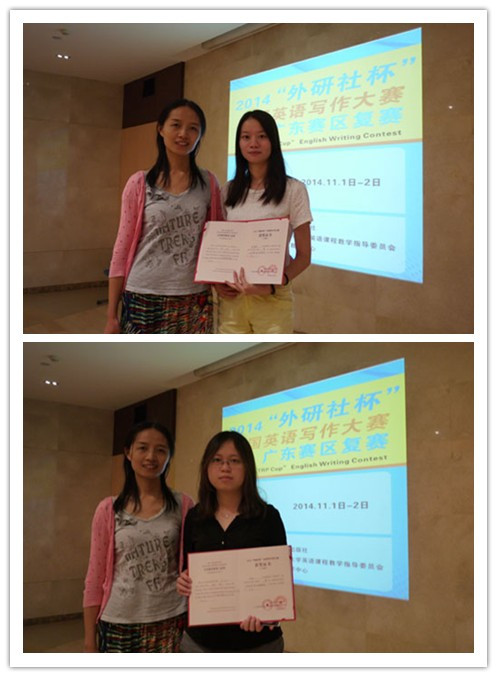 本网讯 近日,在2014年“外研社杯”全国英语写作大赛广东赛区复赛中,我校2012级商务英语专业陆健芬同学荣获一等奖,2013级商务英语专业陆欣同学获得三等奖。