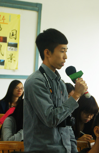 随后,周文让在场的同学模拟召开一场新闻发布会。在场的同学分别扮演来自各个报社的媒体记者和相关政府官员,并就“广州8亿改造陈家祠广场,建好4年又要拆一半”这一个新闻热点进行讨论。