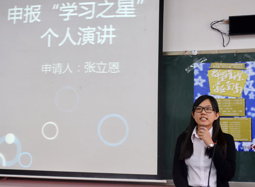 随后,20名候选人依次上台演讲,为自己代言。他们身着正装,精神抖擞,自信十足,怀着对学习的热情和对生活的乐观站在台上,讲述着自己的学习成果与收获。幻灯片上展示着他们丰富且有意义的课余生活,以及他们获得的荣誉与奖状,现场掌声不断。他们中有德语、日语、英语演讲或写作比赛的佼佼者,也有网商大赛、模拟投资大赛的优胜者,有发表论文、践行创新实践项目的科研达人,更有广之旅、广交会还有各类志愿者、学生干部等社会实践经验丰富的杰出学生代表,他们演讲风格各异,但都形象鲜活,思路清晰;他们集荣誉于一身,但却不骄不躁,不断努力。