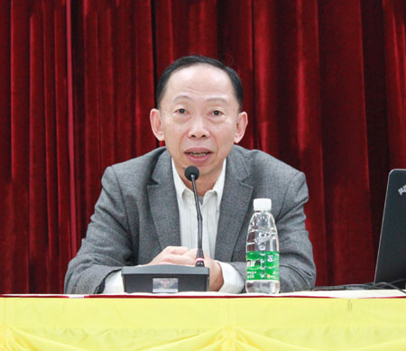 随后,广东外语外贸大学原党委常委、副校长董小麟教授以“党的性质和指导思想”为主题,开讲党校培训第一课。他采用了大量的党史和先进党员的事例向入党积极分子细致地解读了党的性质和指导思想,他认为,党的性质和指导思想是密不可分的,在党的正确领导下我国在网络技术、太空技术、海洋技术等方面取得了飞跃式的进步。董小麟指出党的十八大报告和习近平总书记的讲话都充分体现了党和人民的鱼水关系。只有依靠人民群众,把人民群众的期望化为发展前进的动力,才能实现国家的稳定和发展,才能实现中国梦。董小麟希望同学们用“坚信、坚定、坚持、坚决”的信念支撑自己的共产主义信念,同时他鼓励同学们争做传递正能量的核心领导人,继承优良的品德,走好人生的道路。