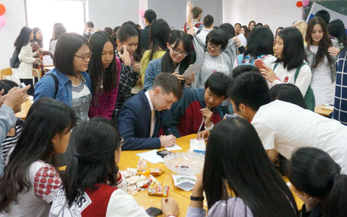 在结束上午的交流会后,代表团一行前往了我校举办的中俄学生谈话会。6至8名俄语系的同学与俄罗斯学生组成谈话小组。在将近2个小时的交流中,来自俄罗斯的学生与南商学子逐渐打成一片,互相用着手机和手上的资料介绍着自己的国家和文化。代表团学生之一的Лёва说:“能够参加这样的谈话会,我觉得十分开心,因为可以遇上中国的同学,了解与俄罗斯不同的文化和知识。”