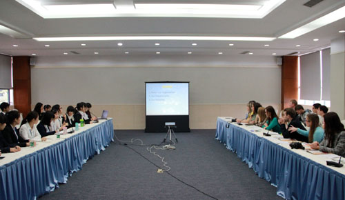 在谈话会的期间,代表团的学生用PPT的形式为参加在场的同学展示了俄罗斯的文化和风俗以及介绍了他们的大学。一位俄罗斯女生在展示过程中,还带了俄罗斯传统配饰供在场学生观赏,让同学们对俄罗斯的文化有更真切的感受。