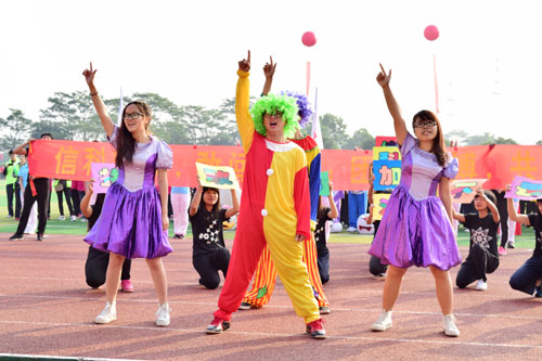伴着音乐,国际工商管理学院师生大步向主席台走来。穿着正装的学生手持蓝扇轻轻拂动,教师举伞夹杂学生间,寓意着教师为学生遮风挡雨;卡通人物与老师共同跳舞,表示快乐学习;以大海为背景,以海鸥为代表的海洋色彩,带领观众走入了一个融洽的氛围。一曲《小苹果》提前将开幕式推向高潮,信息科学技术系展出了“信科精英、敢闯敢拼、团结拼搏、共创辉煌”的风采。