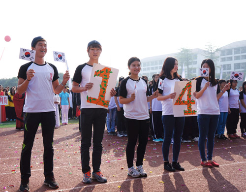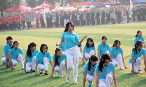 中国语言文学系为观众带来了一场精彩的年代秀。随着“汉唐”二字展出,“岂曰无衣,与子同袍”汉服表演成为一道亮丽的风景线;紧接着“1949”字样摆出,老师们做起了怀旧早操;韩日留学生举着自己国家的国旗和“2014” 的牌子昭示中外情谊与时俱进。