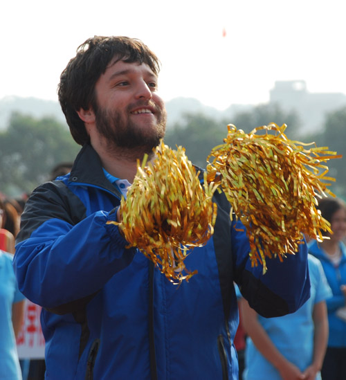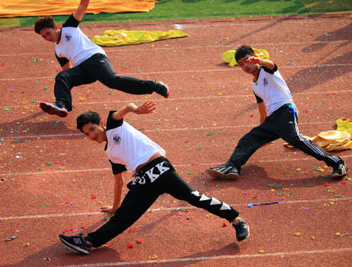 穿着各色披风的六名学生引领东方语言文化学院方阵向我们走来。各色各样的舞蹈、不断变化的文字、师生托起的金太阳,引起了在场观众的热烈掌声。英语语言文化学院师生随着激昂音乐走来。最吸引人的是伴着街舞表演在操场上接力跑的学生,他们双手捧着横幅,身穿荧光色马甲,穿过人群跑向教师队伍。来自2013级商务英语3班的石奇艳说:“这是我们学院特意安排的接力跑,横幅从学生手上传到老师手上,表达了我们对老师的尊敬,也体现了师生团结的体育精神。”西语学院运动员用手中的扇子变化出各种图案。