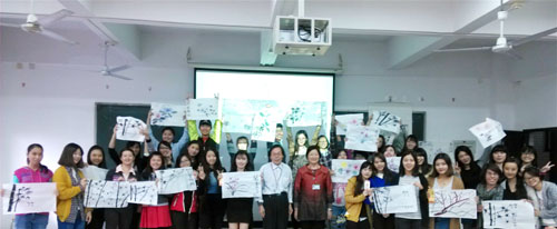 此次实践教学活动的开展,为中外学生提供了一个汉语沟通交流的平台。外国留学生感受到汉语和国画的魅力,同时对中国国画的历史文化、技巧手法等方面有了感性的认识。此外,此次活动为对外汉语教师提供了汉语教学方面的宝贵经验。 (中文系 冯薇 周欣茵 林翠花)