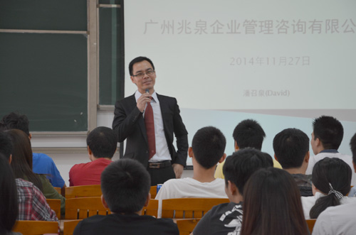 本网讯 近日,广州兆泉企业管理咨询有限公司的创始人潘召泉先生应邀走进《创业管理》课堂,在教学楼G502与国际工商管理学院2012级市场营销创业管理1班、2班以及国际营销全英班的学生开展了一次“大学生创业与就业主题分享交流会”。