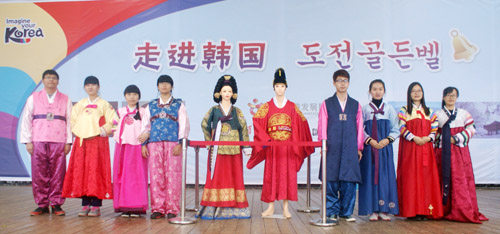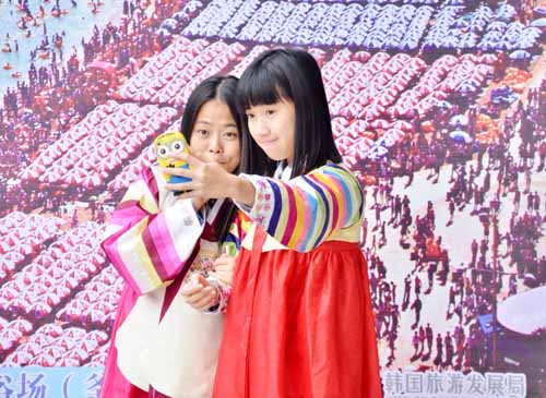 色彩绚丽的韩服吸引了同学们前来试穿,并在舞台上合影留念。来自2012级英语语言文化学院的骆羿嫦表示,这次的韩服体验活动很有意义,以前只能通过电视或网络才能看到的韩服,现在能够直接接触,不仅让她对朝鲜服有了进一步的了解,更对韩国文化有更深层次的认识。