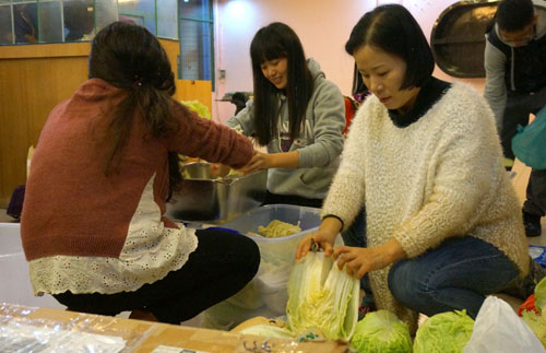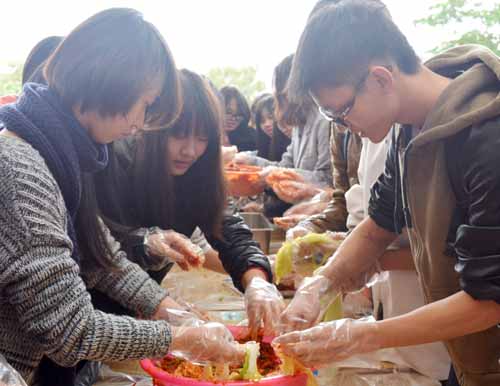本网讯 “把一颗整的白菜分片、均匀地撒盐、放糖……这样,好吃的泡菜就做出来了!”在韩国文化周活动上,中韩老师为同学们示范如何制作泡菜,引起了同学们的“围观”和“点赞”。12月3、4日,韩国文化周活动给同学们带来韩服体验和亲手做泡菜活动。