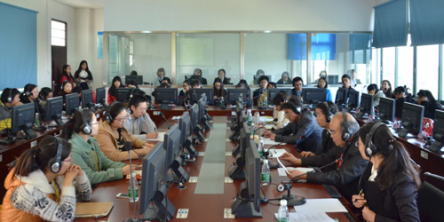 本网讯 近日,东方语言文化学院“阿、日、韩”三语同声传译实践活动在实验室501举行。与会老师围绕“关于我校学生综合素质的培养”这一主题,分别用阿拉伯语、日语、朝鲜语进行讨论,学生进行同声传译。常务副校长袁长青,副校长赖志立应邀观摩活动。