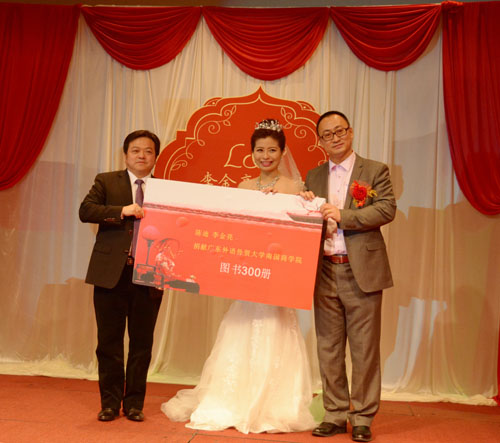 学校副校长赖志立代表学校接收了捐赠的图书,并向小古堂书店表示诚挚的感谢。捐赠仪式别开生面,在店主李金亮先生和我校陈迪老师的婚礼现场举行。