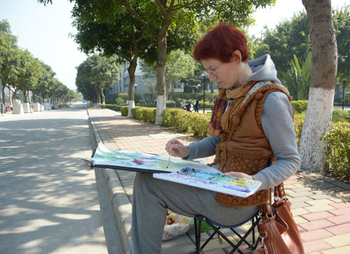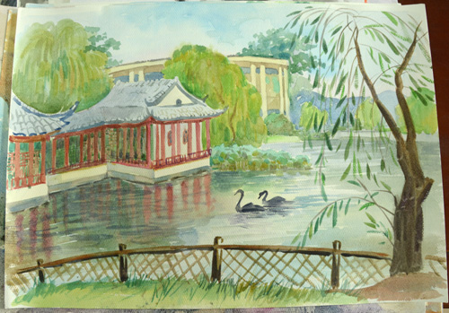 课余时间,Svitlana Baklytska会背着她的画板到校园的各个角落写生作画。无论是充满了中国古典风韵的亭台楼阁还是生机盎然的花草树木,或是碧波荡漾的湖水,都是她绘画的素材,从Svitlana Baklytska的画作中能够看出她对校园和生活的无限热爱。 (刘阳)