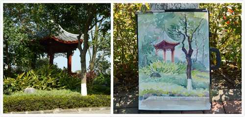 Svitlana Baklytska妙笔生花,画作中的见贤亭被树木簇拥,青灰色的琉璃瓦古色古香,朱色的柱子质朴文秀,画中有景,景中有画。Svitlana Baklytska表示,她特别喜欢中国的文化和南商这座美丽的校园,希望用画笔将校园的美景展现出来。