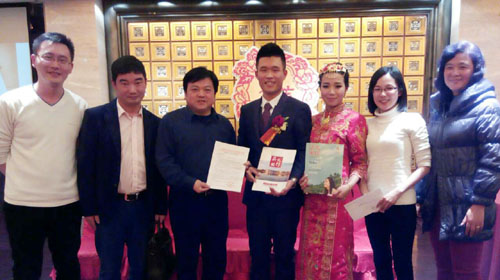 本网讯 3月7日是2008级校友詹焕泰举行婚礼的日子。在这个特别的日子里,詹焕泰收到一份来自母校特别的礼物——学校副校长赖志立为其颁发“校友讲师”聘书。接受聘任后,詹焕泰说:“在婚礼上收到母校的这份礼物,让我们的婚礼显得更有意义。我要感恩母校,绝不会辜负母校信任和鼓励。”