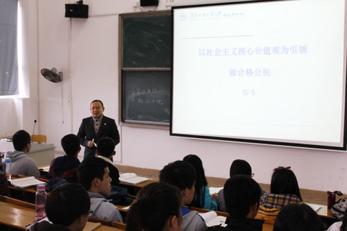 本网讯(记者 江萌萌)3月12日上午,党委书记黎冬在C502给同学们讲授《形势与政策》课。黎冬以“以社会主义核心价值观为引领,做合格公民”为主题,从“培育和践行社会主义核心价值观的重大意义”和“如何培育和践行社会主义核心价值观”两个方面形象生动地讲授这一堂课。