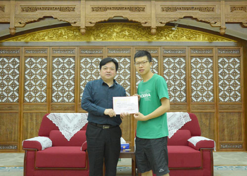 本网讯 4月10日,学校副校长赖志立代表学校向“航拍兄弟”颁发荣誉证书和3000元奖金,鼓励他们继续发挥创新实践精神,大胆探索,创作出更多精彩的作品。