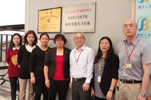 本网讯 4月22日,英语语言文化学院院长沈三山一行来到钟落潭镇妇联儿童活动中心,受到钟落潭镇党委曾结嫦书记热情接待,双方签署了大学生校外实践实习基地协议书并进行了授牌仪式。