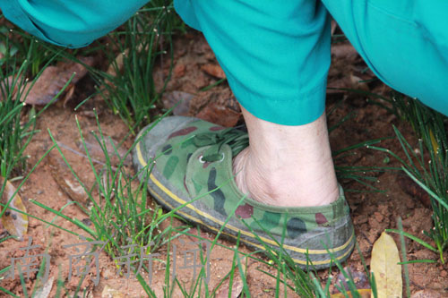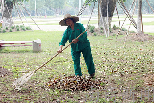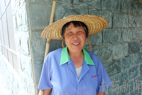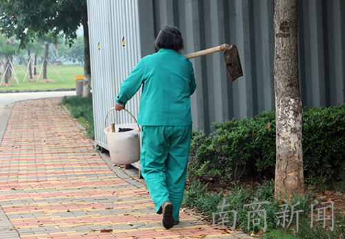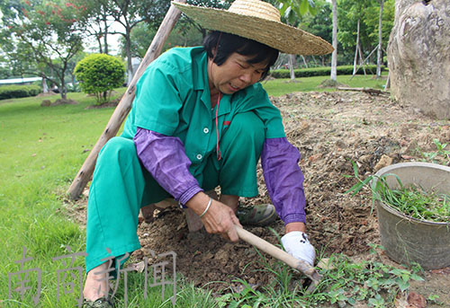 阿姨正在为一棵大树除草,她说为这样的树除草要花费1个小时的时间。她说在这里工作了好多年,家就在附近,两个儿子也都毕业了,找到了不错的工作。
