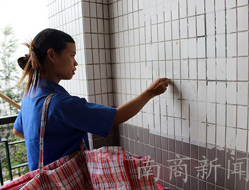阿姨在清扫完教学楼E栋二楼的空教室后,转上三楼。在楼梯间,阿姨看到之前的海报被撕后留下的纸屑痕迹,细心地把小纸屑一点一点撕下。