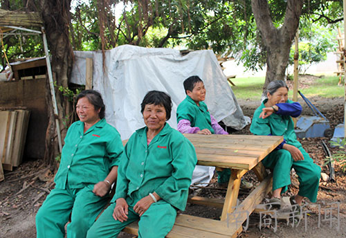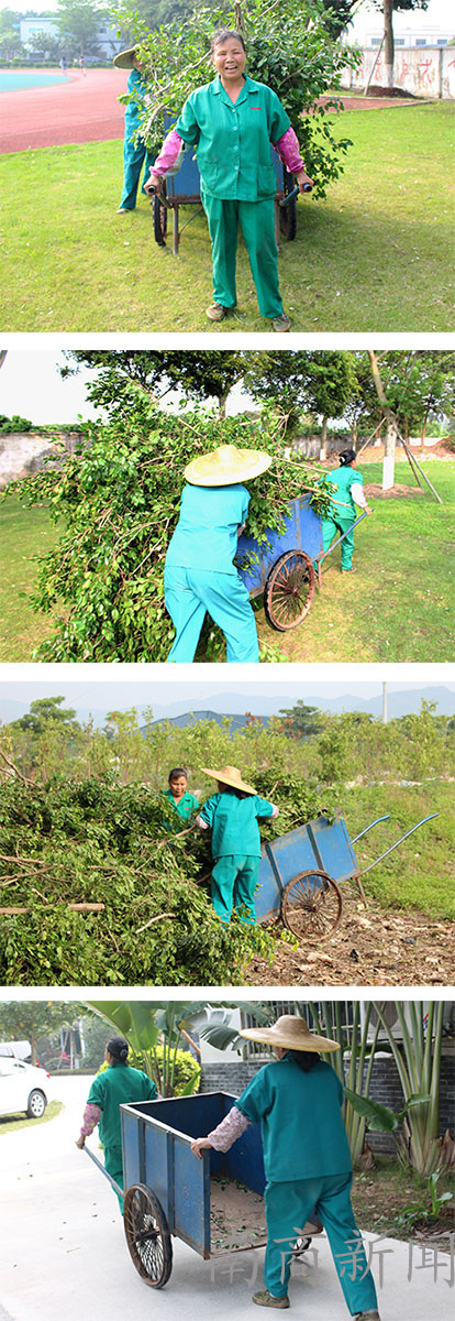 由于树枝过长过多,阻碍了办公室屋顶的排水,因此阿姨今天要把一些多余、过长的树枝锯掉,并把它们运到操场的另一边。记者说要为她们拍张照,阿姨便面对镜头灿烂地笑起来。阳光虽猛烈,她们却一边闲聊,一边重复着这一工作。
