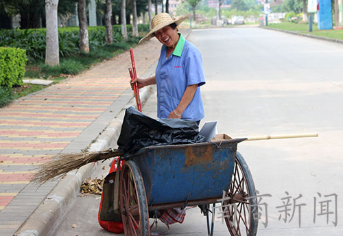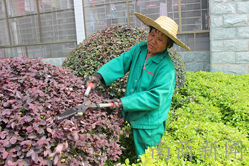 当天的阳光猛烈,阿姨只好全副武装去修剪花草,汗水早已为刘海“造型”。她说,她是这一带花草的“造型师”。