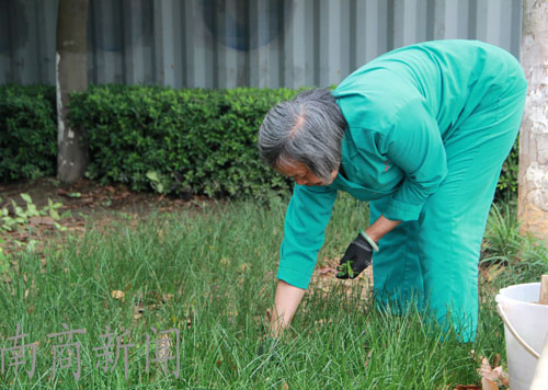 背朝黄土面朝天,阿姨把图书馆后面一带的草坪的杂草拔掉,然后把它们放在桶里。