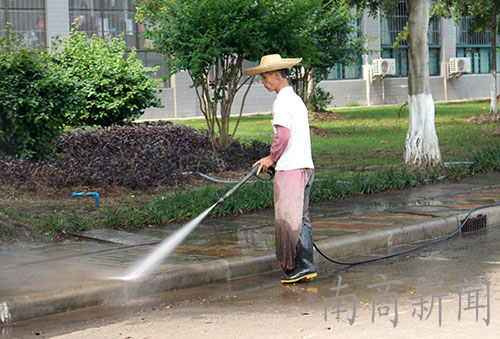 这位阿叔正在用高压水枪冲洗路面。这样的工作需要仔细冲洗每一个地砖,尤其是间隙的位置,切不可马虎,需要耐心。