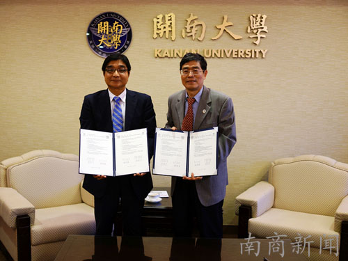 4月28日,代表团访问了开南大学,与该校长林俊彦及副校长林基煌等进行了会谈。双方就开展交流合作等方面进行了讨论,并在此基础上签订了合作协议。随后,我校代表团参观了该校的图书馆、航空运输模拟教室以及健康活动中心。