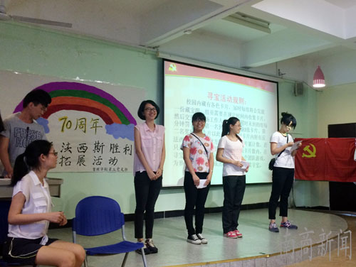 活动伊始,全体成员在F405集合,齐唱国歌,并观看了支部参加红色微电影比赛的作品——《中国梦》,反思自己对“中国梦”的理解。“反法西斯胜利”知识竞答和户外“寻宝之旅游戏”环节让同学们进一步了解了相关的历史知识。