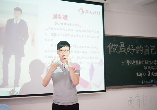 讲座中,吴奕斌分享了自己的大学经历和职场经验。他以自己大学期间通过加入学生会、模特队等社团组织的经历告诉同学们如何丰富自己的校园生活来实现自我增值。吴奕斌擅长魔术表演,在演出中广结善缘,朋友遍布世界各地。他以自己在马来西亚的演出经历为例,鼓励同学们多结交良师益友,结识拥有“人性光芒”的人,传递正能量。