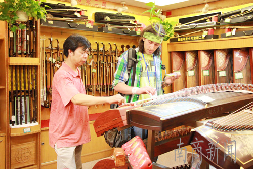 在北京路前往天字码头的旅途中,合唱团一行路过一家乐器店。店里的中国传统乐器一下子抓住了合唱团成员的注意力。Кузьмин С.С.老师以及фаина老师分别购买了一支洞箫以及长箫,并向店铺师傅请教演奏方法。师傅十分热心,亲自出马传授演奏的速成方法。“看到俄罗斯朋友这么喜欢我们中国的乐器,我感到很开心。”店铺师傅说,“希望他们能够尽快学会乐器的演奏方法,将‘中国好声音’传到俄罗斯。”