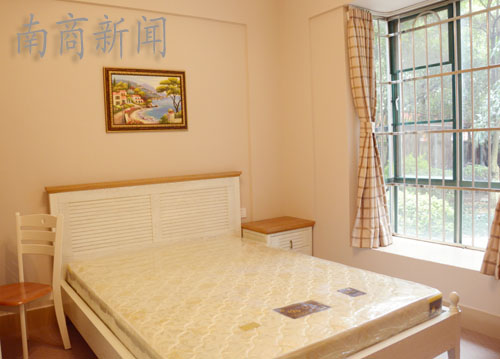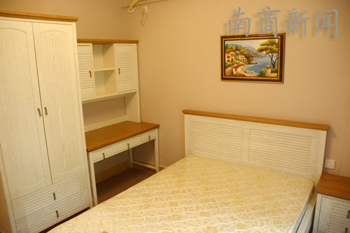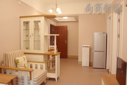 本网讯(记者 黄佳玲)推开门,一眼就看到落地窗前简洁大气的格子布窗帘,宜家风格的家具与散发着暖光的吊灯,营造出浓厚的田园居室风格。近日,学校为外教装修的宿舍样本间已全面完工。