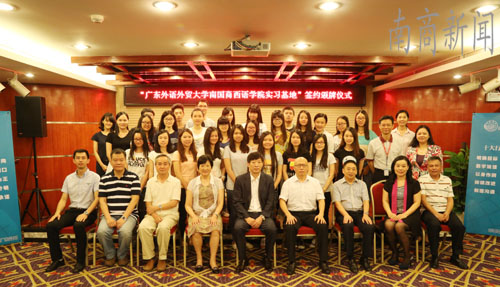 本网讯 6月4日上午,西方语言文化学院与中国国旅(广东)公司举行实践实习基地签约仪式。广州市旅游局副巡视员徐颖,中国国旅(广东)国际旅行社股份有限公司党委书记、董事总经理谷训才,副总经理、党委副书记李丽文,我校副校长王心洁等出席签约仪式。学生处处长,西语学院师生参加了仪式。