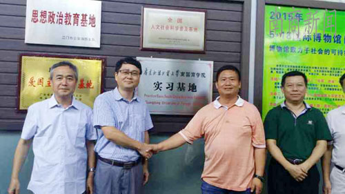 在江门五邑华人华侨博物馆,该馆副馆长黄志强热情接待了我校一行。袁长青一行实地参观了华人华侨博物馆。期间,双方就日后如何开展学生实习实践等事宜进行商讨。随后,双方在博物馆前举行了实习基地揭牌仪式。