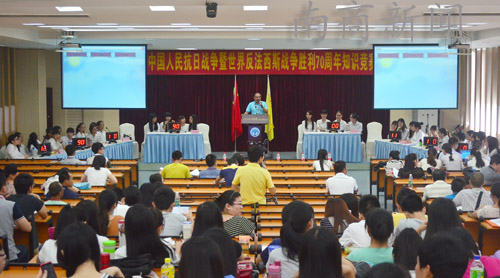 本网讯(记者 黎颖诗)6月25日下午在C201学术报告厅,学校举行中国人民抗日战争暨世界反法西斯战争胜利70周年知识竞赛。党委书记黎冬出席比赛。