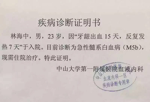 因为医疗条件有限,在医生的建议下,7月13日下午,林海中从揭阳转移到广州中山大学附属第一医院。7月14日,中山一院确诊为急性髓系白血病(M5b)。急性髓细胞性白血病是髓系造血细胞恶性疾病。M5b属于单核细胞白血病的一种,临床表现为贫血、出血、感染和发热、脏器浸润、代谢异常等,多数病例病情急重,预后凶险,如不及时治疗常可危及生命。