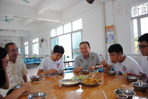 7月15日,黎冬一行来到惠州市龙门县龙田第二小学探望“梦之队”成员。带队老师魏迅鸿和志愿者陪同黎冬参观了学校的宿舍和食堂。在参观学校食堂过程中,适逢调研组的同学在填写调研报告,黎冬借此机会提醒调研员调研报告的重要性,并为其提出了建设性的建议。随后,黎冬一行与志愿者们共进午餐。同行的工会主席李旭赞扬了同学煮的饭菜简单而美味,并与做饭的同学交流做菜心得。师生之间的亲密交流,使午餐气氛和乐融融。最后,黎冬嘱咐同学们要用积极向上的精神面貌为孩子们带去正能量。 (综合)
