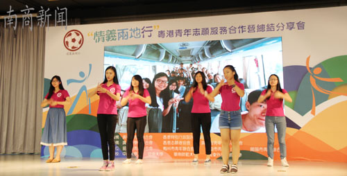 当天下午,活动总结分享会在广州举行。会上,各服务队展示了志愿服务期间的成果,回顾了服务路上的点滴回忆,表演了自编自导的精彩节目。我校学生和香港大学生以“爱的星空”为主题,共同表演了手语舞蹈《爱》及大合唱《仰望星空》,获得了现场阵阵掌声。在访谈环节中,播放了我校吴扬宇同学受访视频,他分享了服务期间的成长收获和感人故事。
