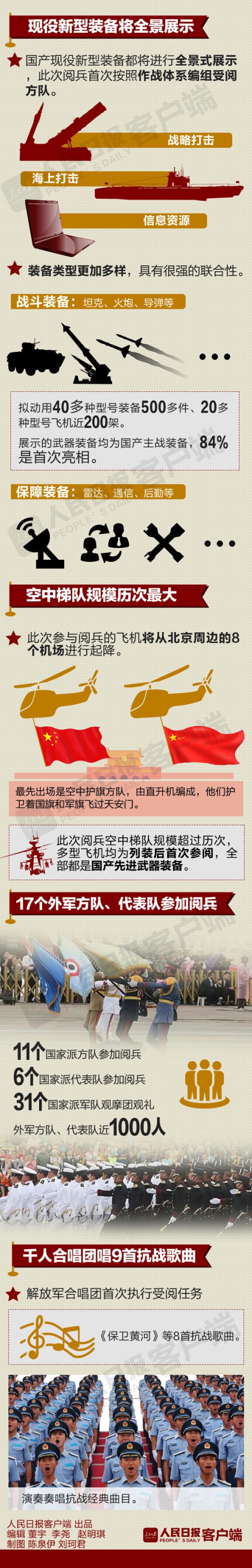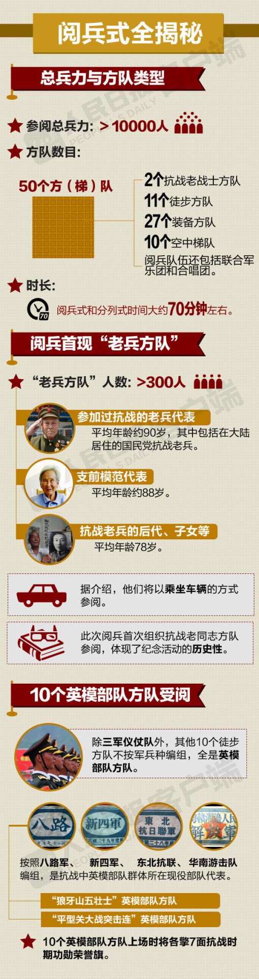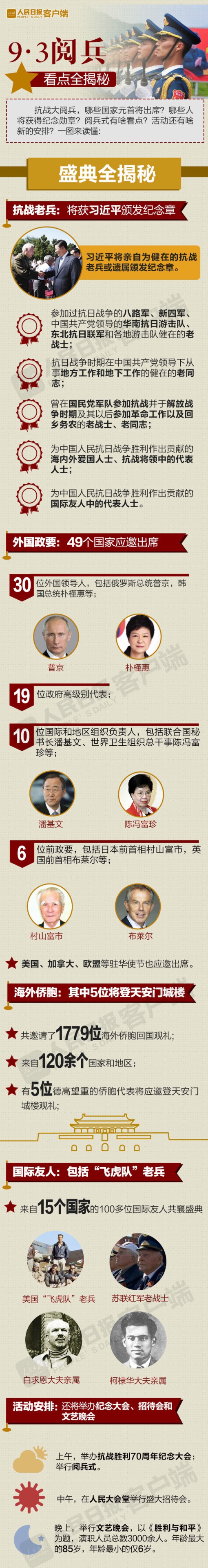 2015年是中国人民抗日战争暨世界反法西斯战争胜利70周年。“9.3”大阅兵在即,届时,北京天安门地区及长安街沿线将举行盛大的阅兵和庆祝活动。国家主席习近平将如何向老兵致敬?哪些国家政要将出席阅兵?我军又会有哪些先进武器装备亮相……面对这些问题,我们为你整理了此次阅兵的12大看点,快来先睹为快!