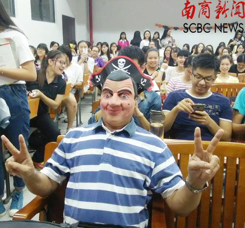 本网讯 10月28日晚上,橘黄的南瓜灯挂在F106教室,外教们变身为“海盗”,与同学们欢聚在英语角,开展了一场万圣节欢乐派对。