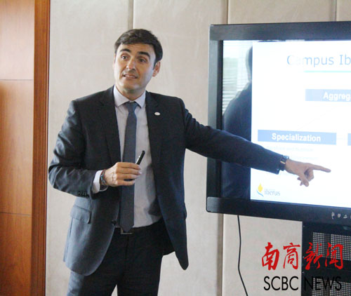 Oscar Lopez通过PPT展示了伊倍鲁斯联校的情况,包括其所处地理位置、师生情况、学校资源以及发展战略目标等等。他表示此次访问是为了开启更加创新更加有利的合作。“亚洲是伊鲁倍斯联盟开展国际合作战略目标的一个重要环节,而中国是其战略目标开展的重要处所。” Oscar Lopez希望,伊倍鲁斯联校将和南商进一步开展合作,互派老师和学生交流学习,并且在教育和科研等方面能加强联系和沟通。