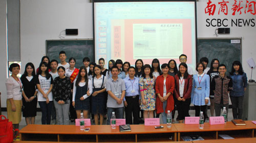 图书馆馆长陈文澜对活动做总结。本次读书工程月活动开展得如火如荼,英语语言文化学院张映先教授主讲的文化学术讲座《<红楼梦>翻译与欣赏》吸引了近100名读者听众;“我的历史上的今天”电子报纸设计大赛收到作品149幅,经图书馆宣传工作小组的两轮评选,选出优秀获奖作品10幅;2014-2015学年度借阅图书排行前十名的读者人均读书149.4册;上学期共有6名勤工、21名志愿者在工作中表现突出,成为学生工作团队的优秀代表。陈文澜还用一组数字图片为大家展示了现代人的读书趋势,阐述了读书的重要性,鼓励大家积极关注并参与图书馆的读书月活动。